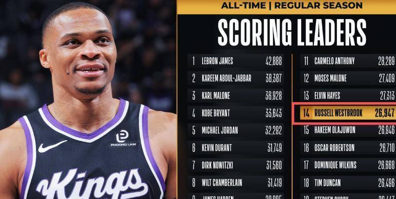 你们说说,这对比是不是绝了? 一个是谁啊? 哈基姆·奥拉朱旺! “大梦”! 火箭队史第一人,两届总冠军,历史盖帽王,那“梦幻脚步”养活了多少篮球培训班? 人家那是进了名人堂、球衣退役、市中心立雕像的级别。 另一个呢? 37岁的威少,今年在国王拿的是一年360万的无保障底薪,说难听点,随时可能卷铺盖走人。 一个是在山顶殿堂里供人瞻仰的丰碑,一个是在泥地里打滚还想继续跑的老兵。 这俩人的名字,居然在历史得分榜上,就这么擦肩而过了? 威少26947分,大梦26946分,就多那么1分! 历史第14位,坐稳了。