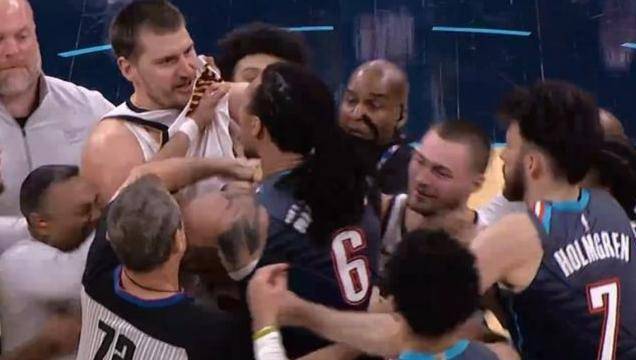 真正的风暴在第四节降临。 雷霆凭借麦凯恩、多尔特等人的三分球,打出一波11-2的攻势,自开场以来首次反超比分。 就在雷霆起势、主场观众陷入沸腾之际,争议性的一幕发生了。 在一次攻防转换中,无球跑动的约基奇被回防的多尔特从侧后方撞倒,后者有一个明显的发力动作,导致约基奇失去平衡,在地上翻滚了好几圈。 起身后的约基奇怒不可遏,径直冲向多尔特理论,双方脸对脸喷吐着垃圾话。 雷霆队的杰林·威廉姆斯迅速介入,与约基奇发生了激烈的身体接触和拉扯,场面一度混乱,需要工作人员和队友上前将双方分开。